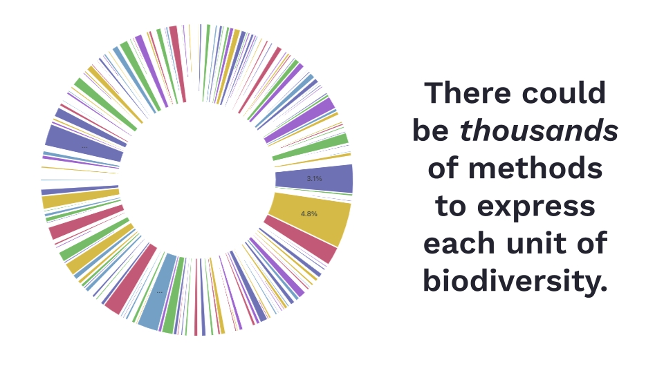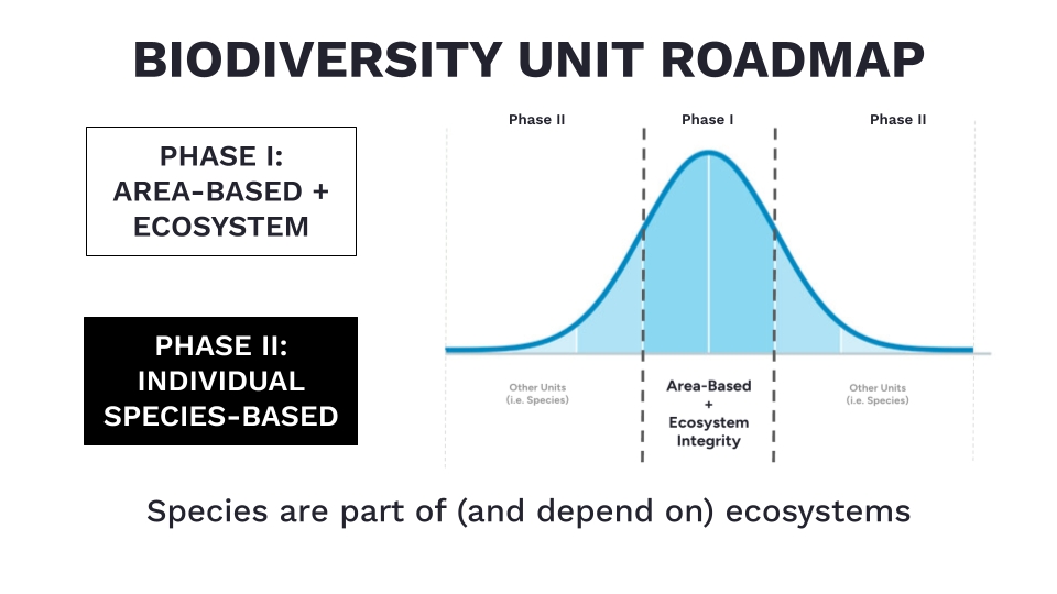 La unidad es solo el formato final. Diferentes ecosistemas y acciones requieren diferentes métricas y metodologías. Analizar los océanos y los sistemas de agua dulce es diferente. La selva es diferente del desierto. Son acciones diferentes, especies diferentes y equipos diferentes. La UNIDAD es cómo comparas lo que hiciste con todos los demás. Es un conjunto estándar de expresiones. Como usamos "hectáreas" en lugar de "acres".