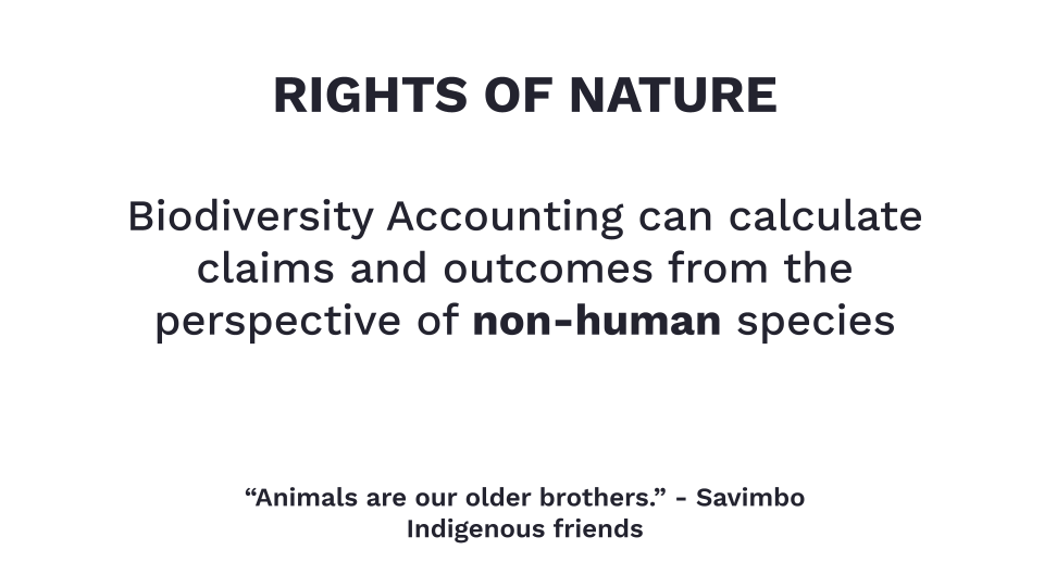 Esta colaboración simplificó rápidamente el problema de una unidad universal de biodiversidad. Como los Pueblos Indígenas entienden claramente, la biodiversidad no puede juzgarse en función de su valor para los humanos, sino que debe medirse desde la perspectiva de un derecho intrínseco a existir. Los problemas científicos y contables insuperables se resuelven limpiamente cuando se recontextualizan con los resultados de otras especies.