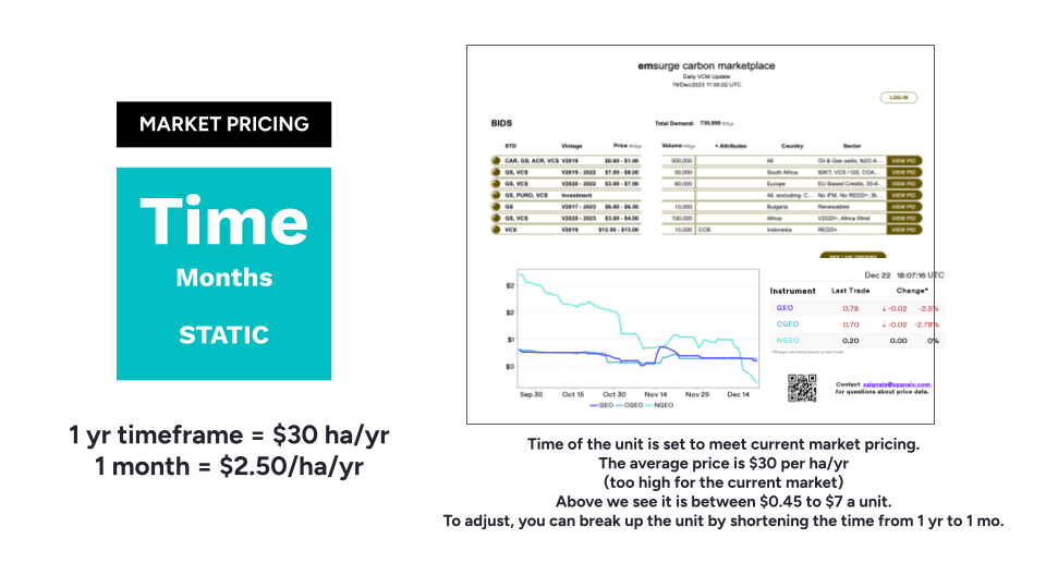 * Los créditos de conservación de 1 año a \~$30 eran menos deseables para los compradores que los créditos de 1 mes a \~$2,50, que estaban más cerca del precio de mercado para los productos básicos de carbono ($1-7).&#x20;