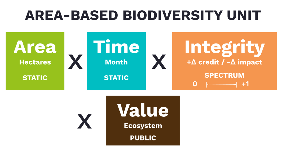Esta es una unidad basada en áreas. Está destinado a medir un ecosistema funcional. Esta unidad de biodiversidad tiene dimensiones estándar (Área, Tiempo e Integridad) y tiene una calificación (Valor).